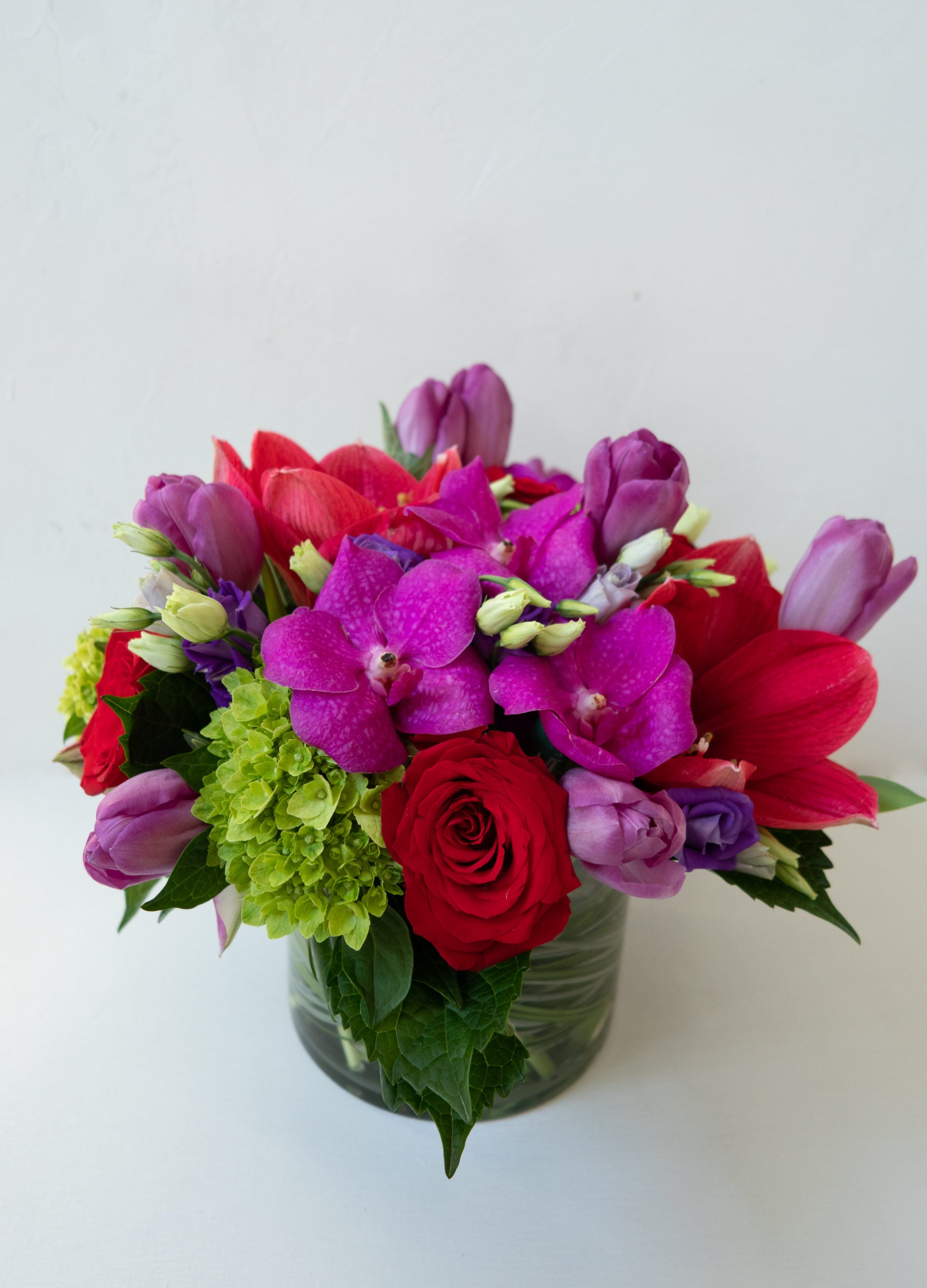 One of our signature low and lush style arrangements consisting of jewel-toned Amaryllis, Hydrangea, Lisianthus, Orchids and Tulips.