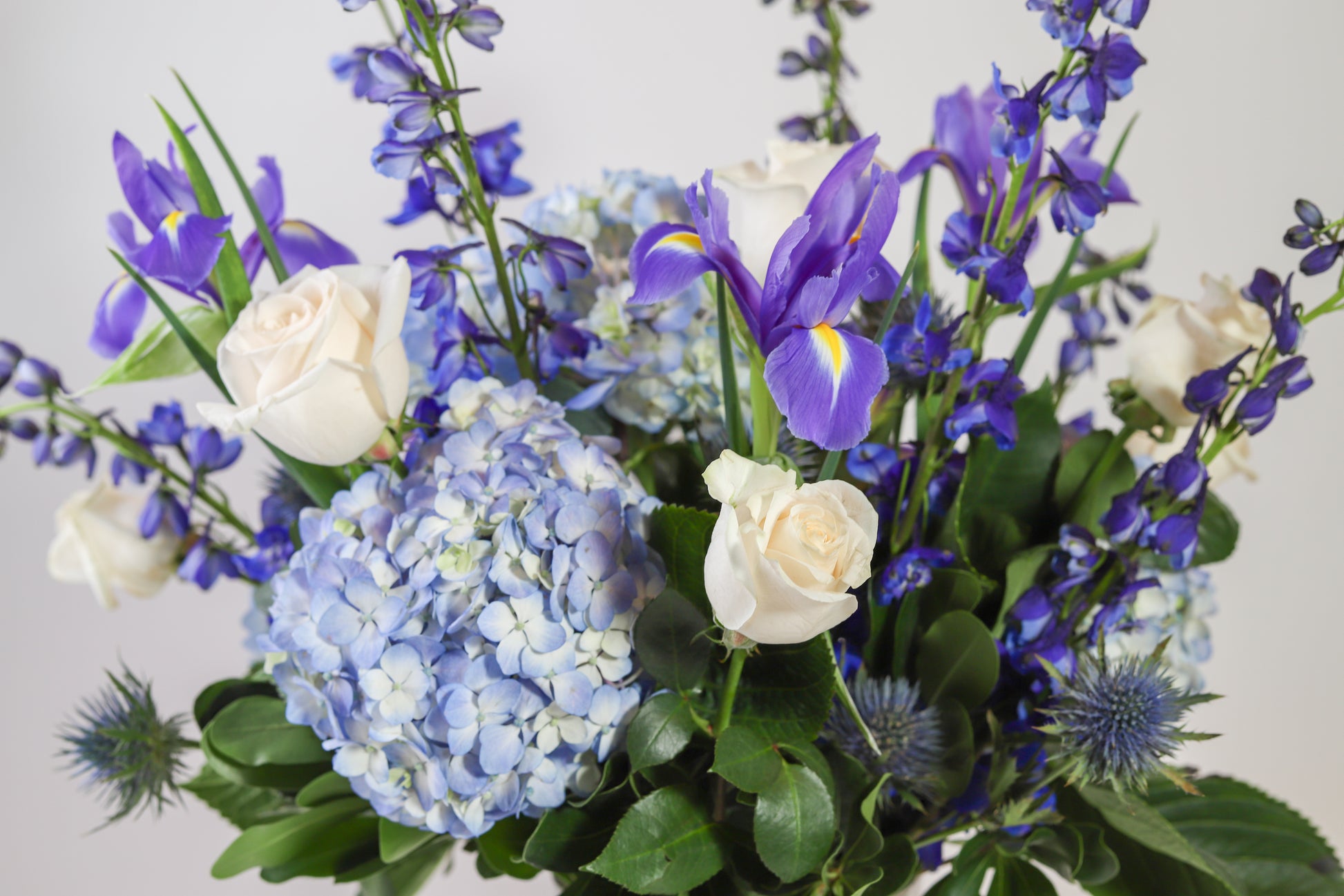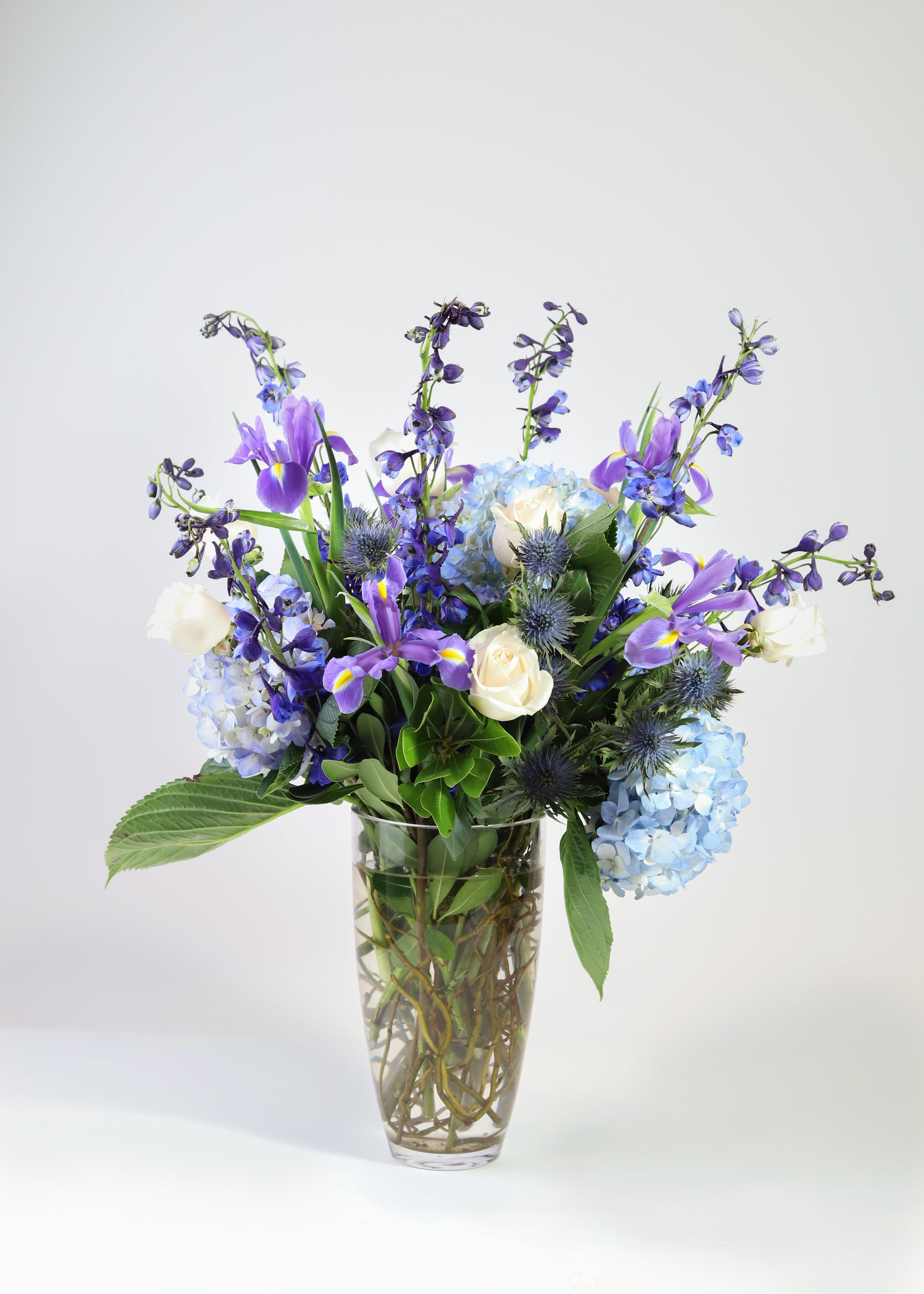 A tall clear glass vase arrangement featuring soothing blue, white & green flowers including Delphinium, Hydrangea, Iris, Roses, Thistle & accenting greenery. Size Medium shown.