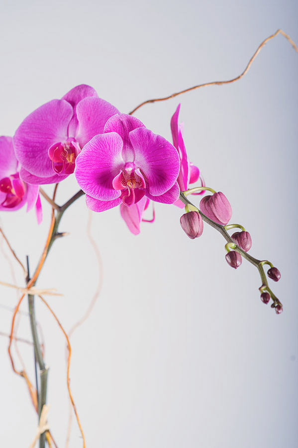 Exotic fuchsia orchid plants are a twist on classic white. Our stunning hot pink exotic orchid plant is potted with moss and supported with dramatic curly willow. The orchid comes in three sizes; a double stem orchid (size beautiful) is shown. A single stem orchid (size pretty) and triple stem (size gorgeous) are also available.