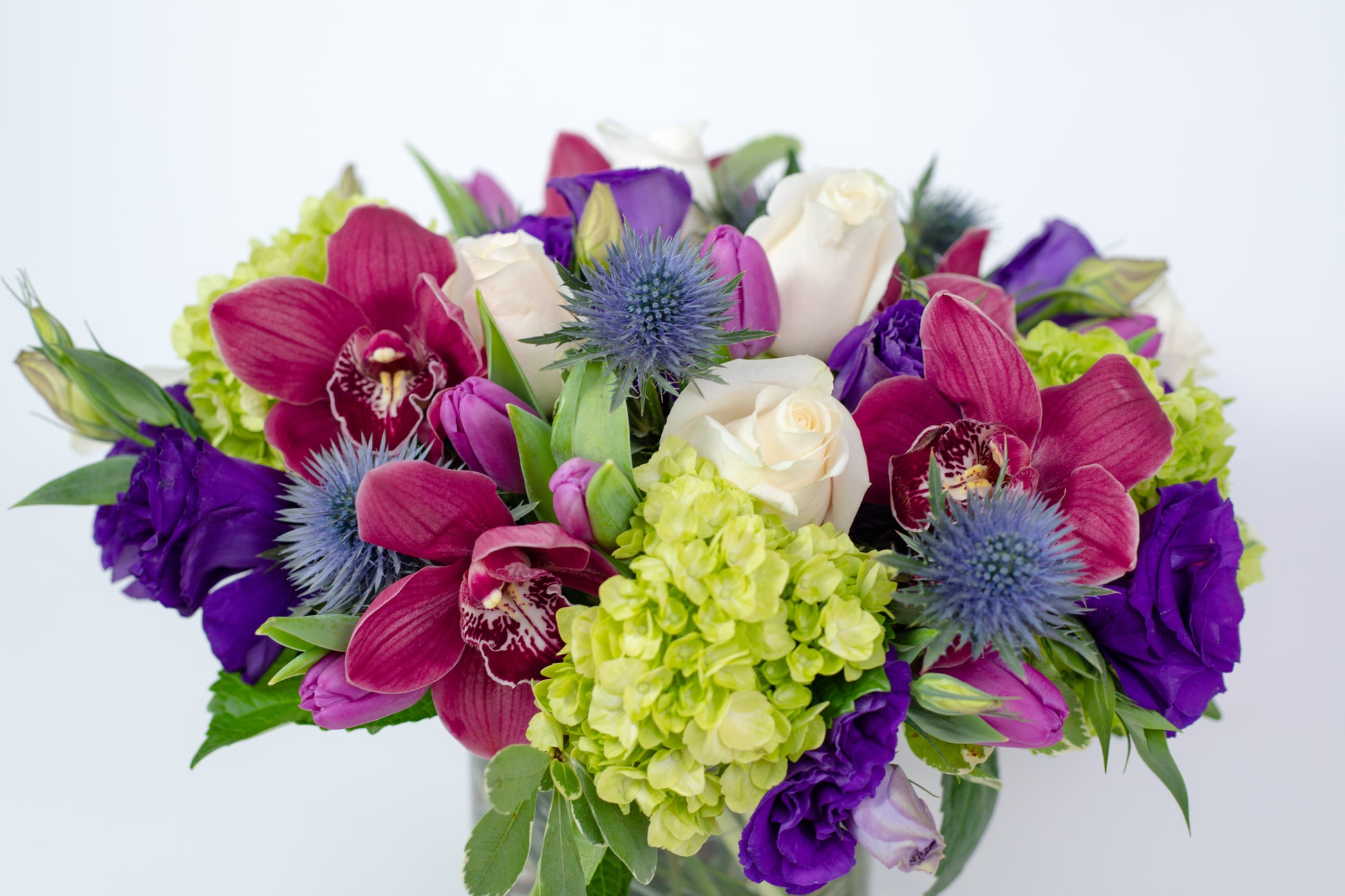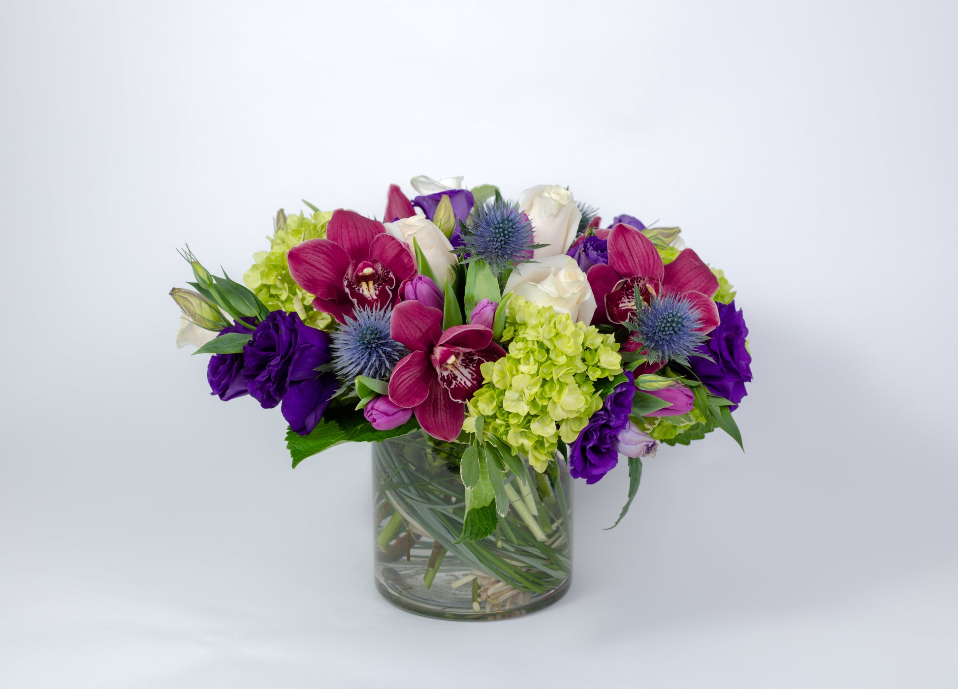 Our signature low & lush style featuring burgundies, greens, purples & whites including Cymbidium Orchids, Hydrangea, Lisianthus, Roses, Thistle & Tulips. Size medium shown.