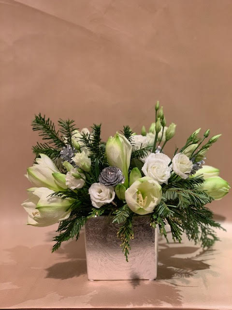 Built in a vibrant silver cube with white amaryllis, lisanthus, seasonal greens and ornamental pine cones, his arrangement shines bright even as the days get shorter.