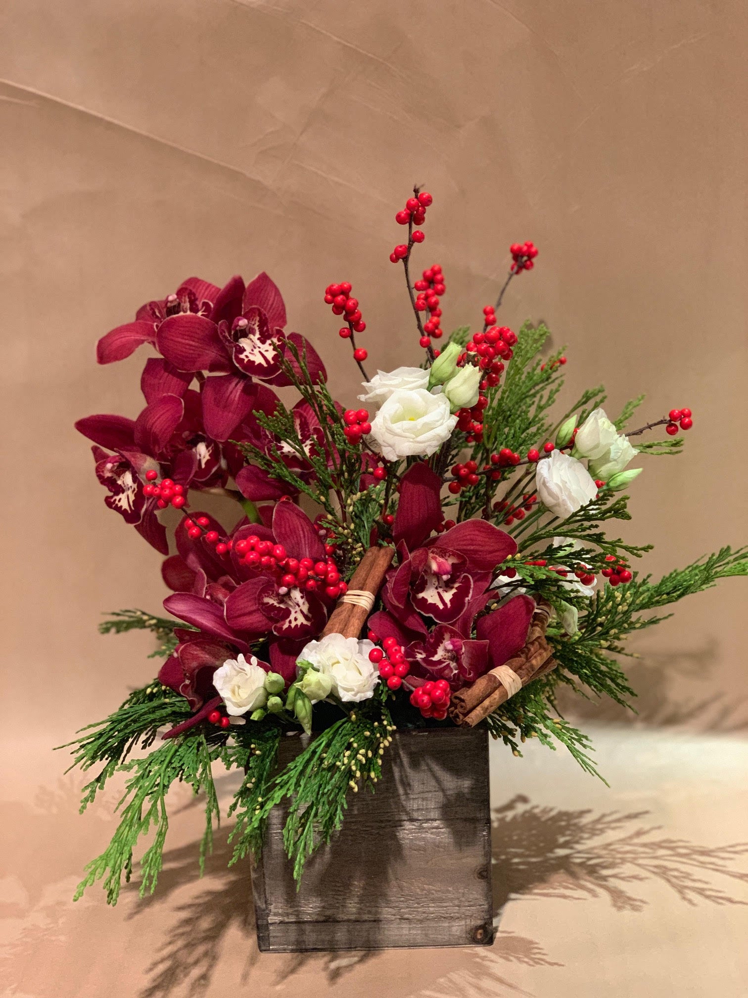 A seasonal arrangement just in time for the Holidays, this arrangement comes in a square wooden box with burgundy cymbidium orchids, white lisianthus, red ilex berries and seasonal greenery.