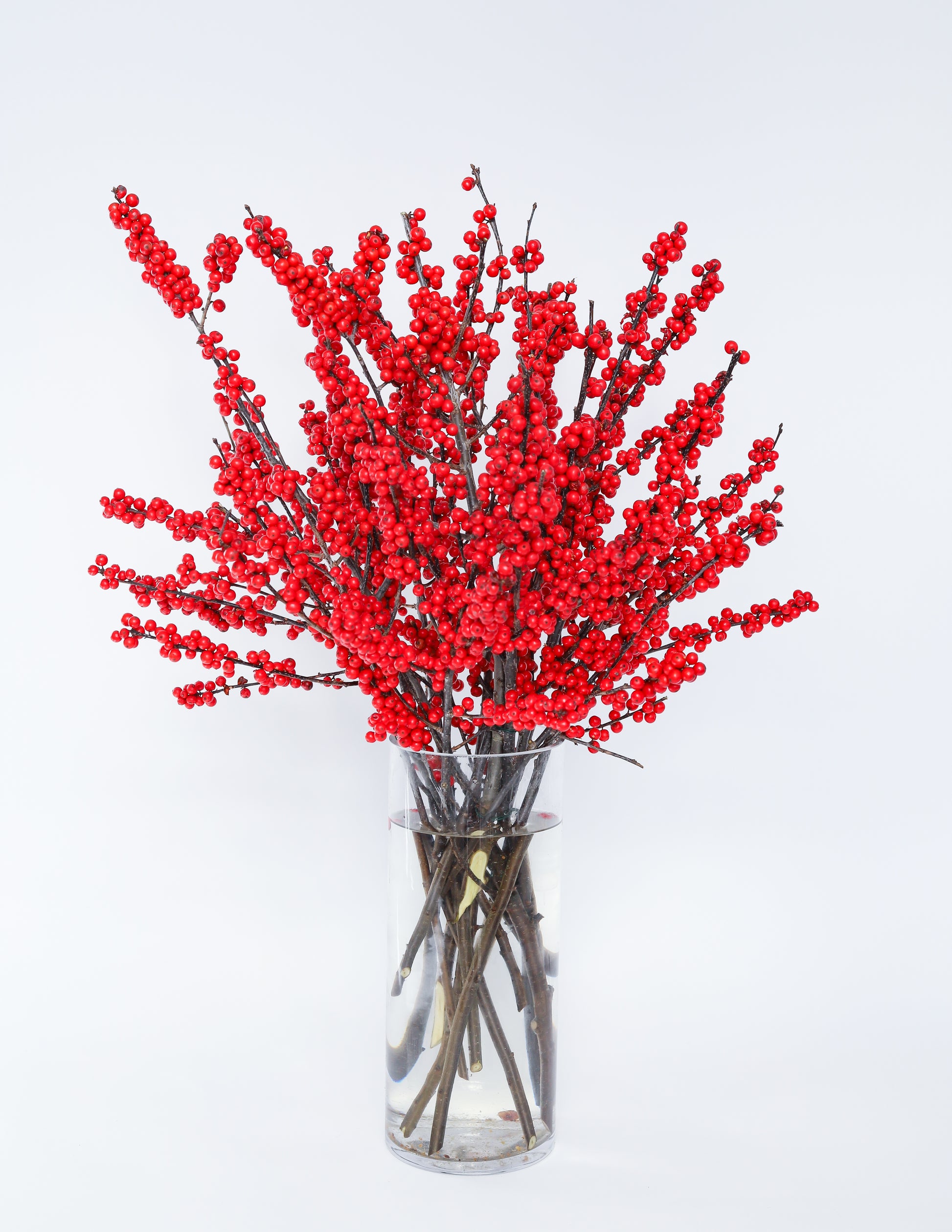 A tall arrangement of local Ilex berries arranged in a clean, simple clear glass vase. Perfect for an entryway, kitchen island, buffet or anywhere you need to make a wintery statement! Size medium shown.