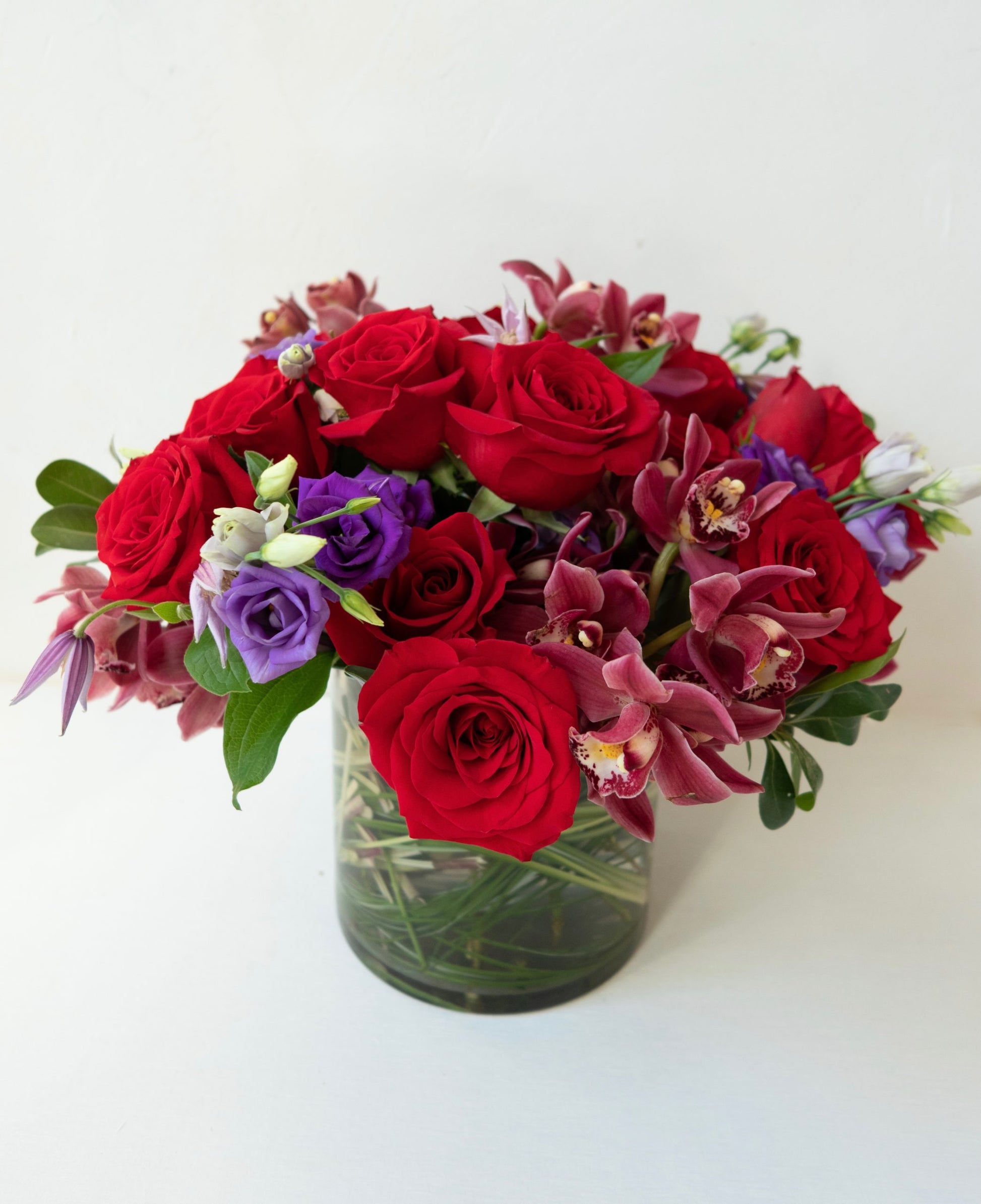 An opulent display of beautiful Clematis, Lisisanthus, mini Cymbidium Orchid sprays and Roses is sure to excite and delight.