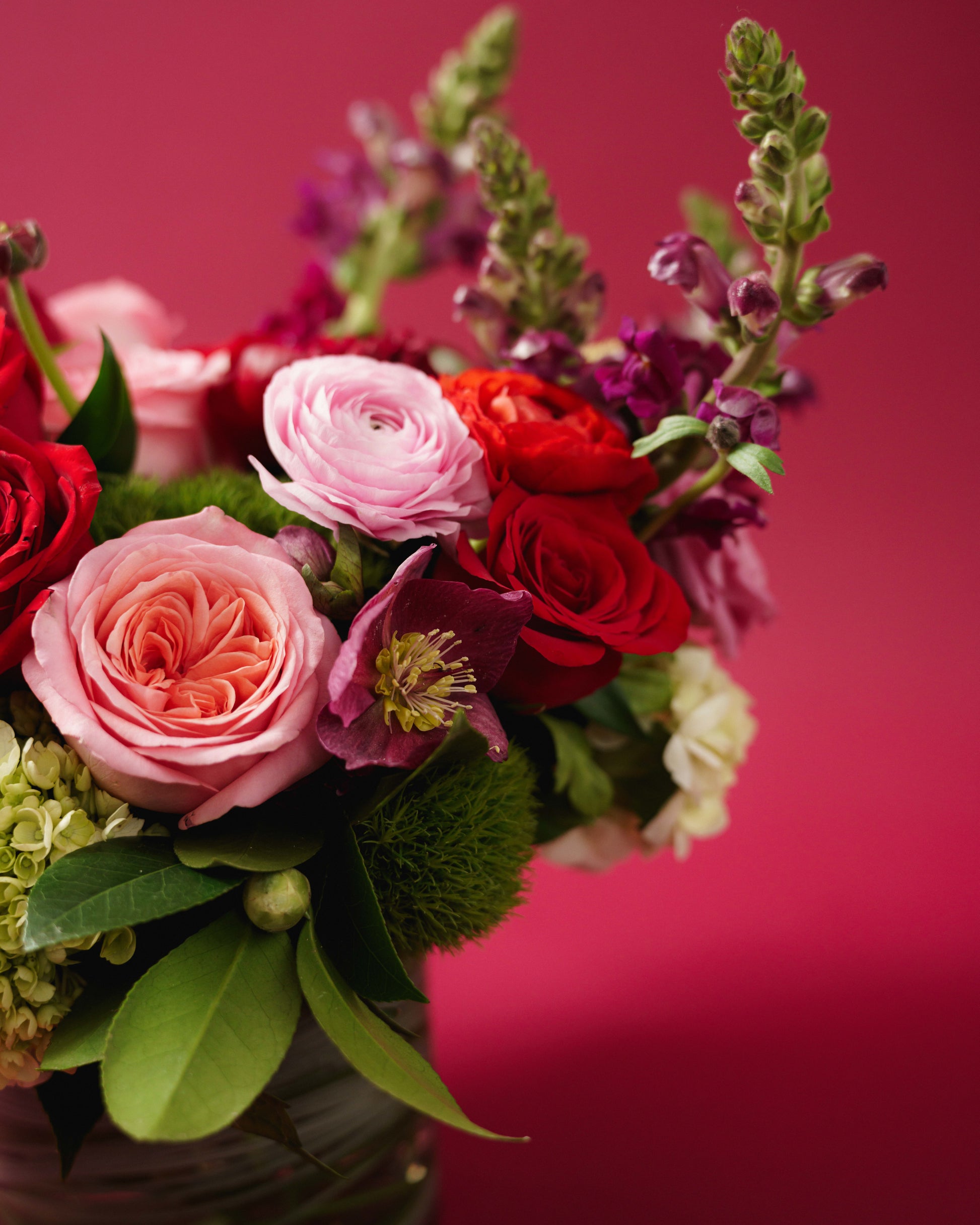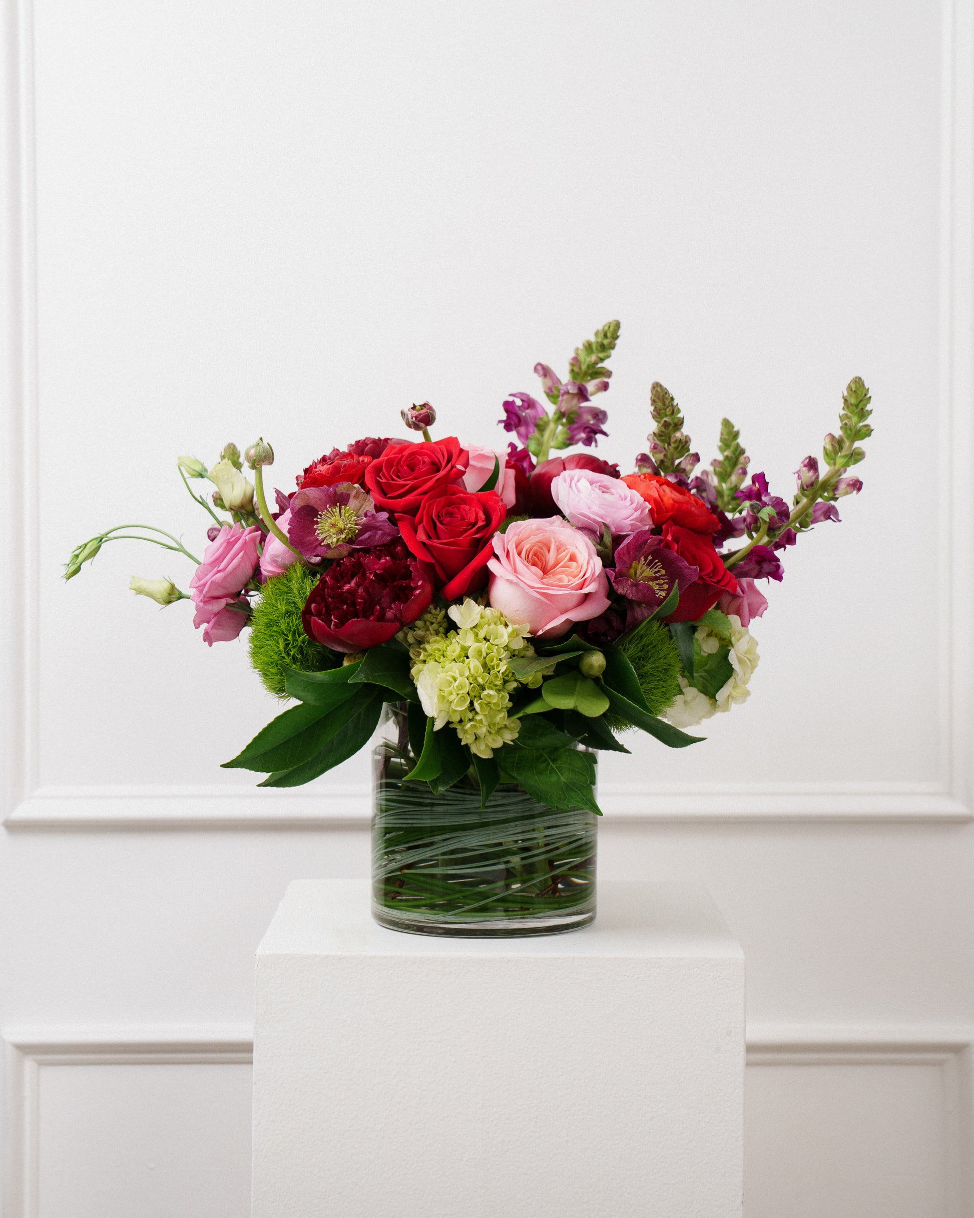 A selection of pink and red florals arranged in a glass cylinder vase featuring flowers such as roses, ranunculus, lisianthus, snapdragons, and green hydrangea. Size Medium shown.