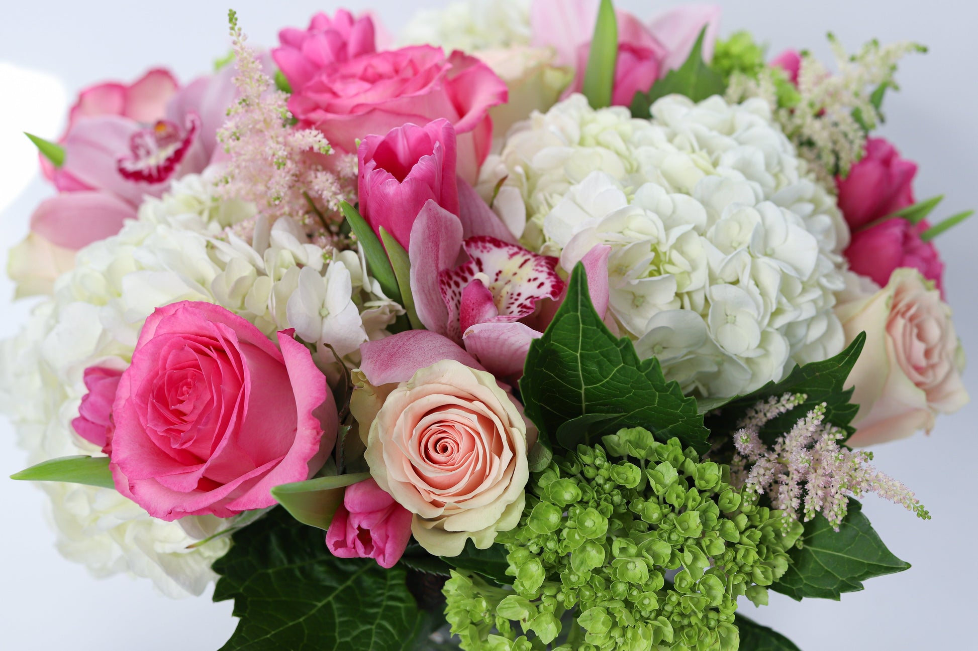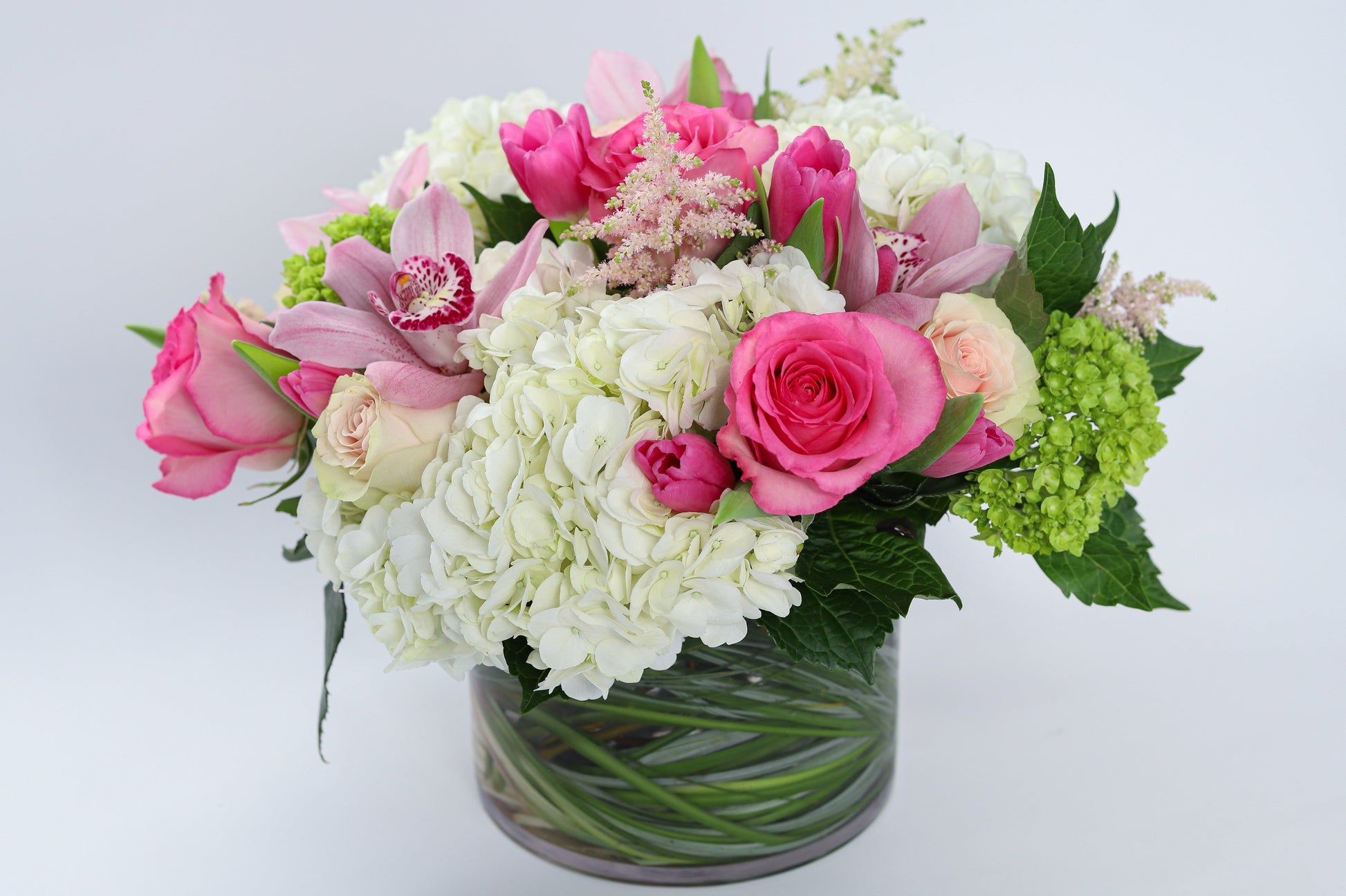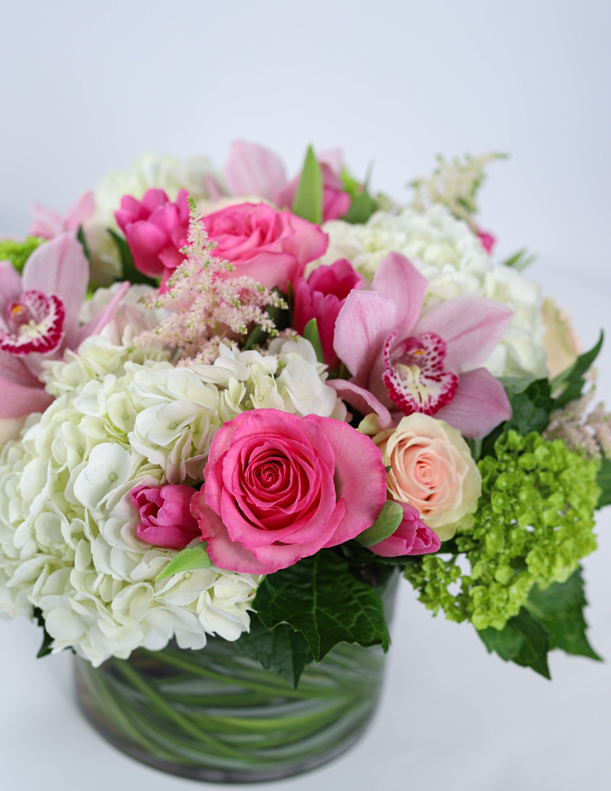 A low & lush arrangement featuring soft toned pinks, whites & greens with Astilbe, Cymbidium Orchids, Hydrangea, Roses, Tulips & accenting greenery. Size Medium shown.