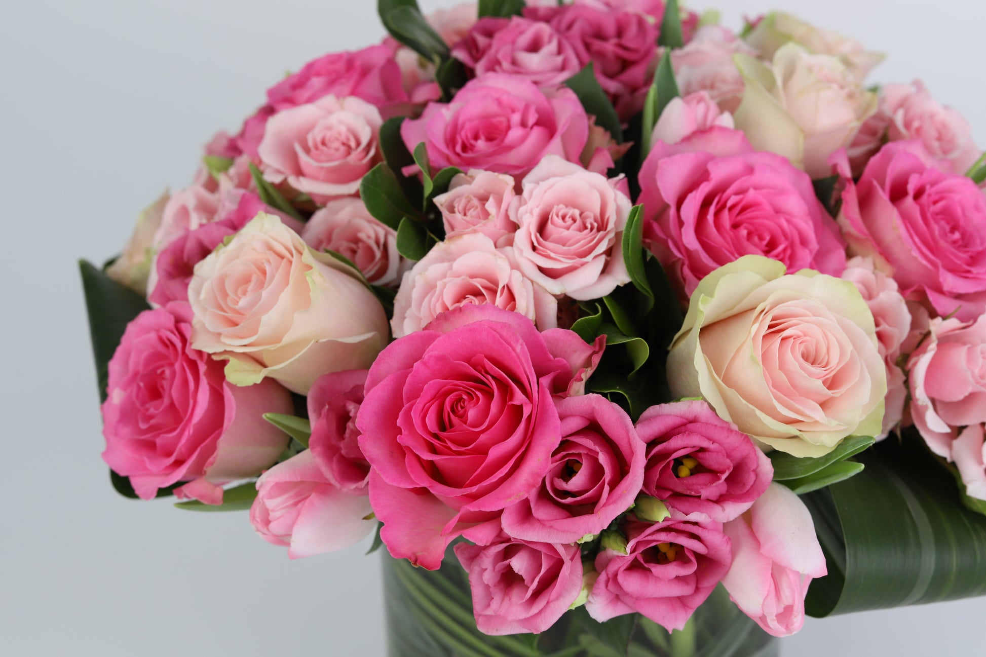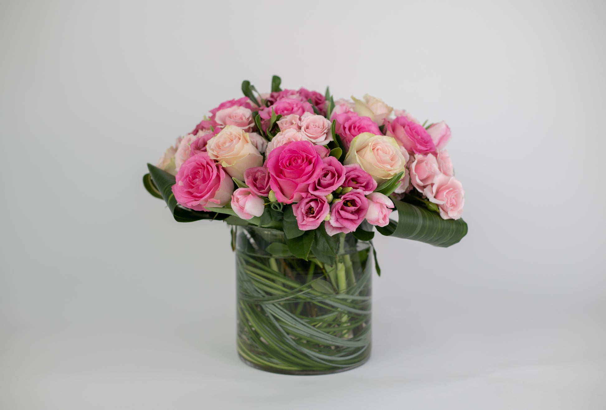 Varying hues of rosy pinks including Lisianthus, Roses, Spray Roses & accenting greenery in a large half cylinder vase is sure to make a statement!