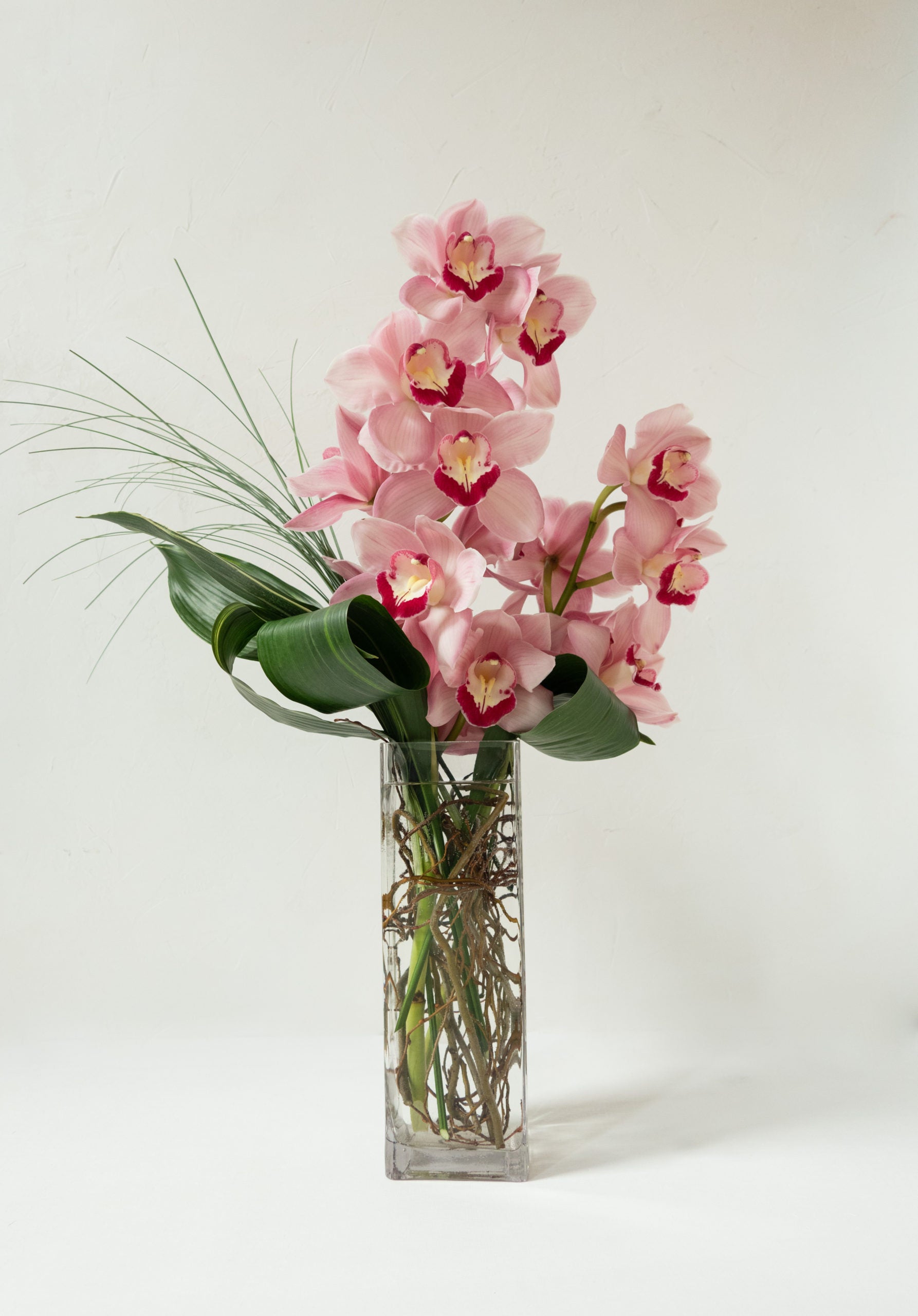 Two gorgeous Cymbidium Orchid sprays in a tall clear glass vase with accenting greens, this arrangement is sure to make a statement!