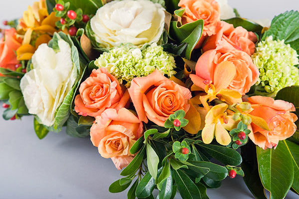 Celebrate family and friends with this abundant centerpiece of autumn flowers in seasonal hues. Family Gathering brings the best of the season to your table's centerpiece. Abundance overflows with brassica cabbages, roses, hypericum berries, thistle and other autumnal specialties. Size Medium is shown.