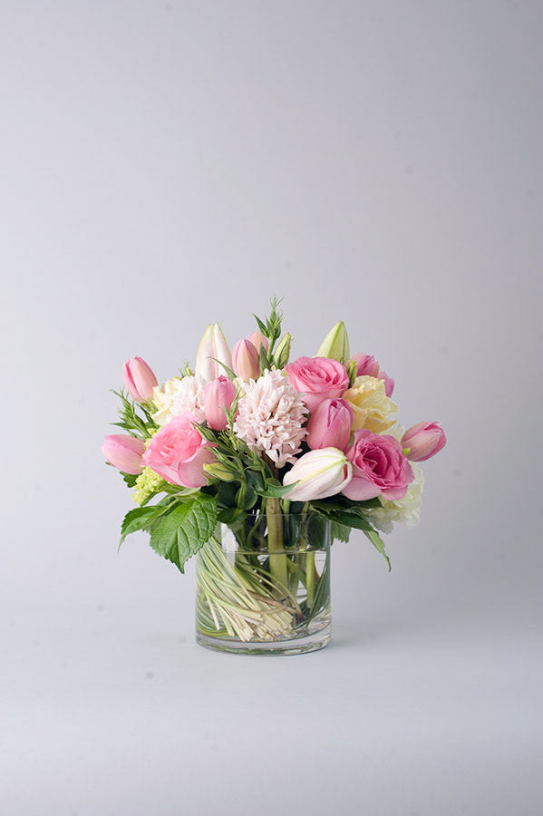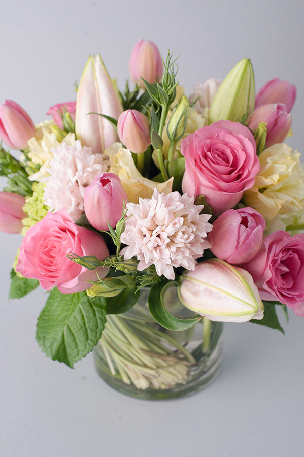 Spring flowers in delicate soft pinks fill this eye-catching arrangement. Femme Fatale includes premium European flowers in petal pink such as tulips, lisianthus, and roses with green hydrangea. This delicate floral arrangement is perfect for any occasion from celebrating a new baby girl to a romantic birthday.