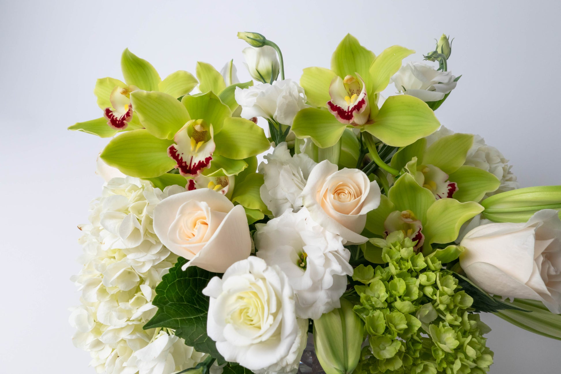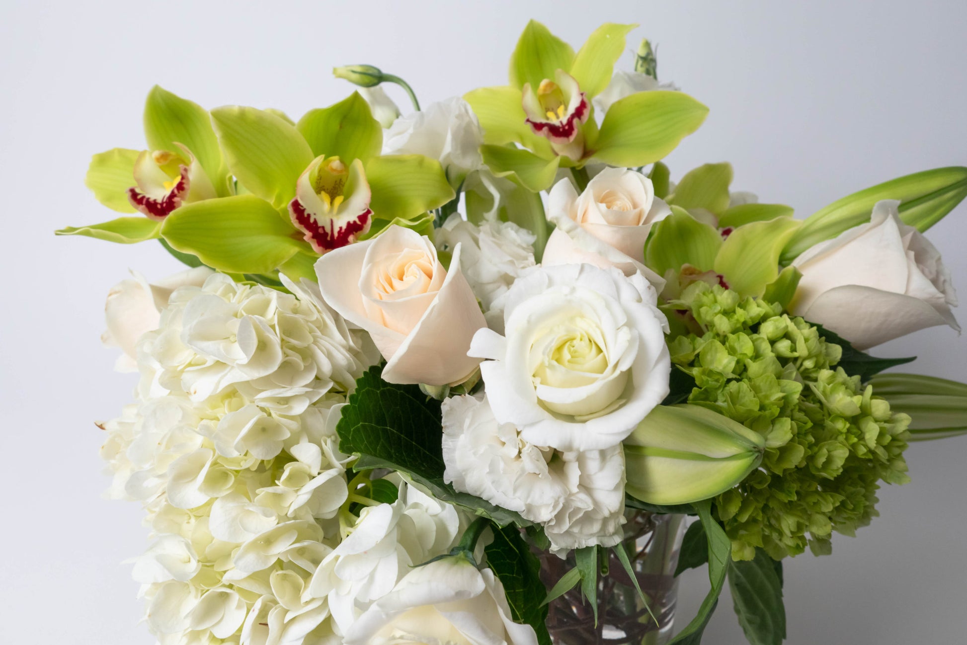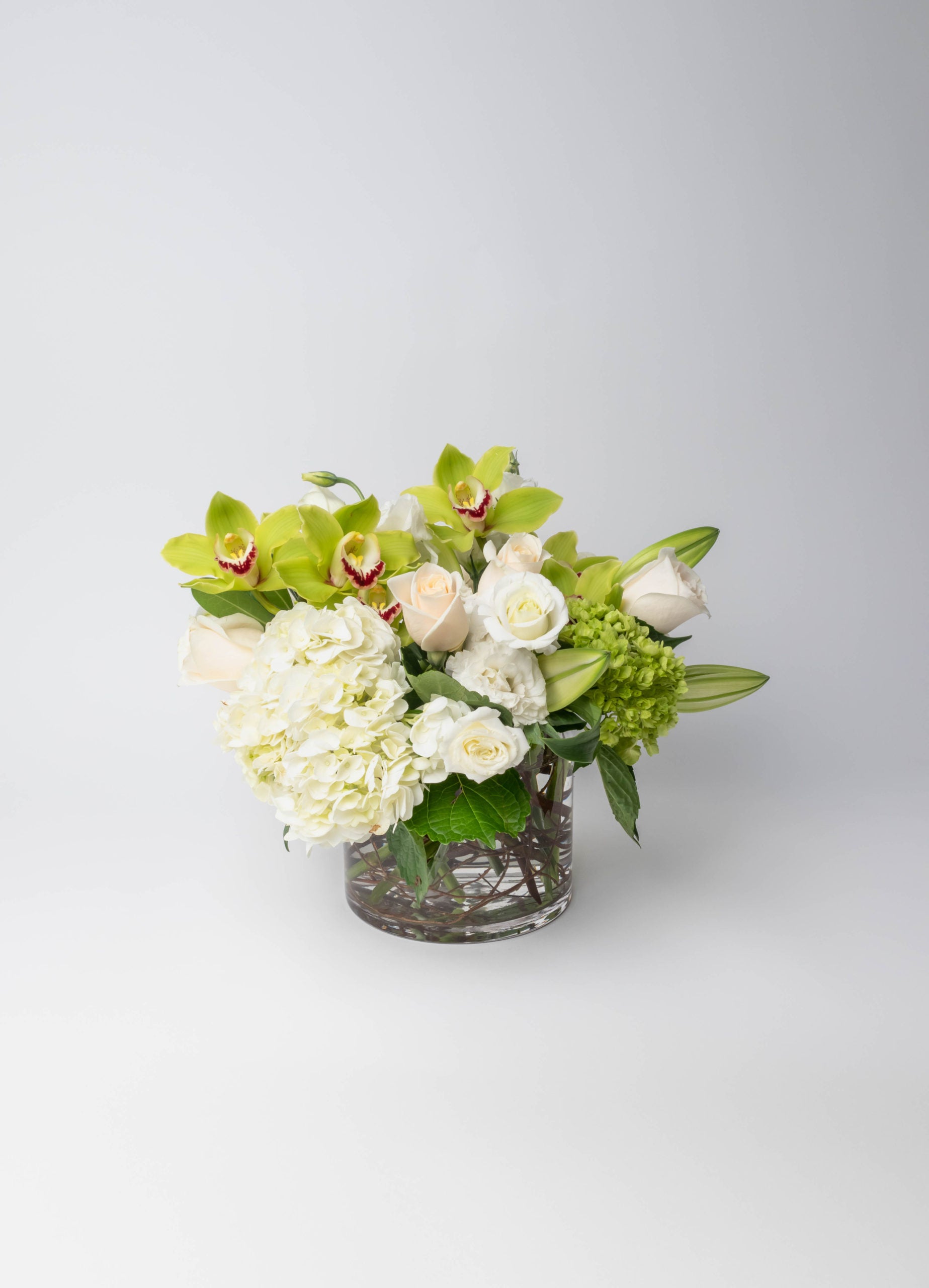 Fresh green and white colors and interesting textures complement any decor. White and green hydrangea, white casablanca lilies, white roses and green cymbidium orchids are accented with seasonal foliage. Size medium shown.