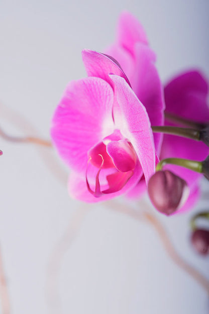 Exotic fuchsia orchid plants are a twist on classic white. Our stunning hot pink exotic orchid plant is potted with moss and supported with dramatic curly willow. The orchid comes in three sizes; a double stem orchid (size beautiful) is shown. A single stem orchid (size pretty) and triple stem (size gorgeous) are also available.