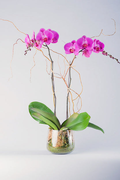 Orchid plants should be kept in moderate sunlight at 65-70 degrees. Due to the fact we plant our orchids in a glass vase they need to avoid being over-hydrated. We recommend putting 1-3 ice cubes or 1-3oz of water on top of the moss and allowing them to melt once every 10-14 days. This should keep the moss moist but not saturated. The blooming cycle should last about one month.