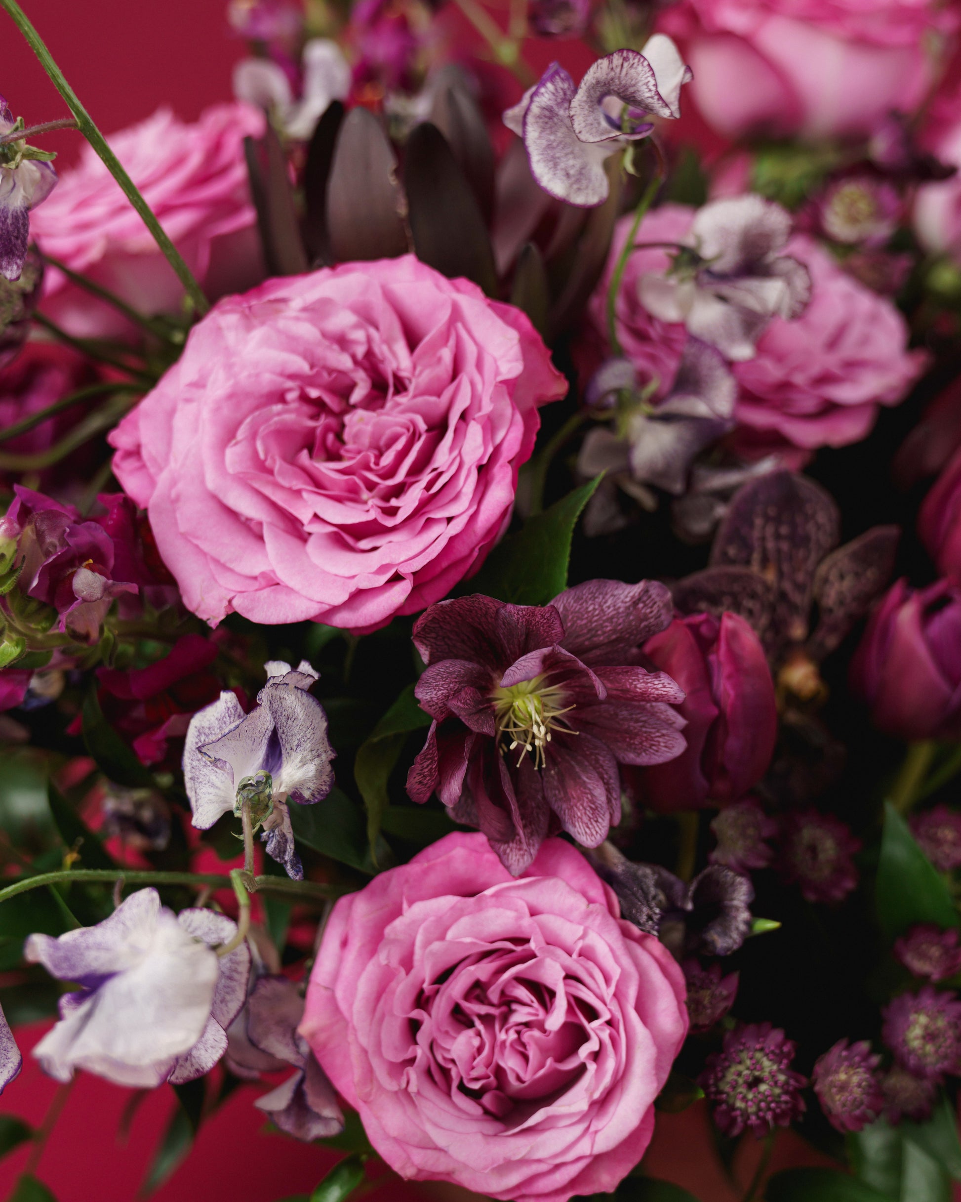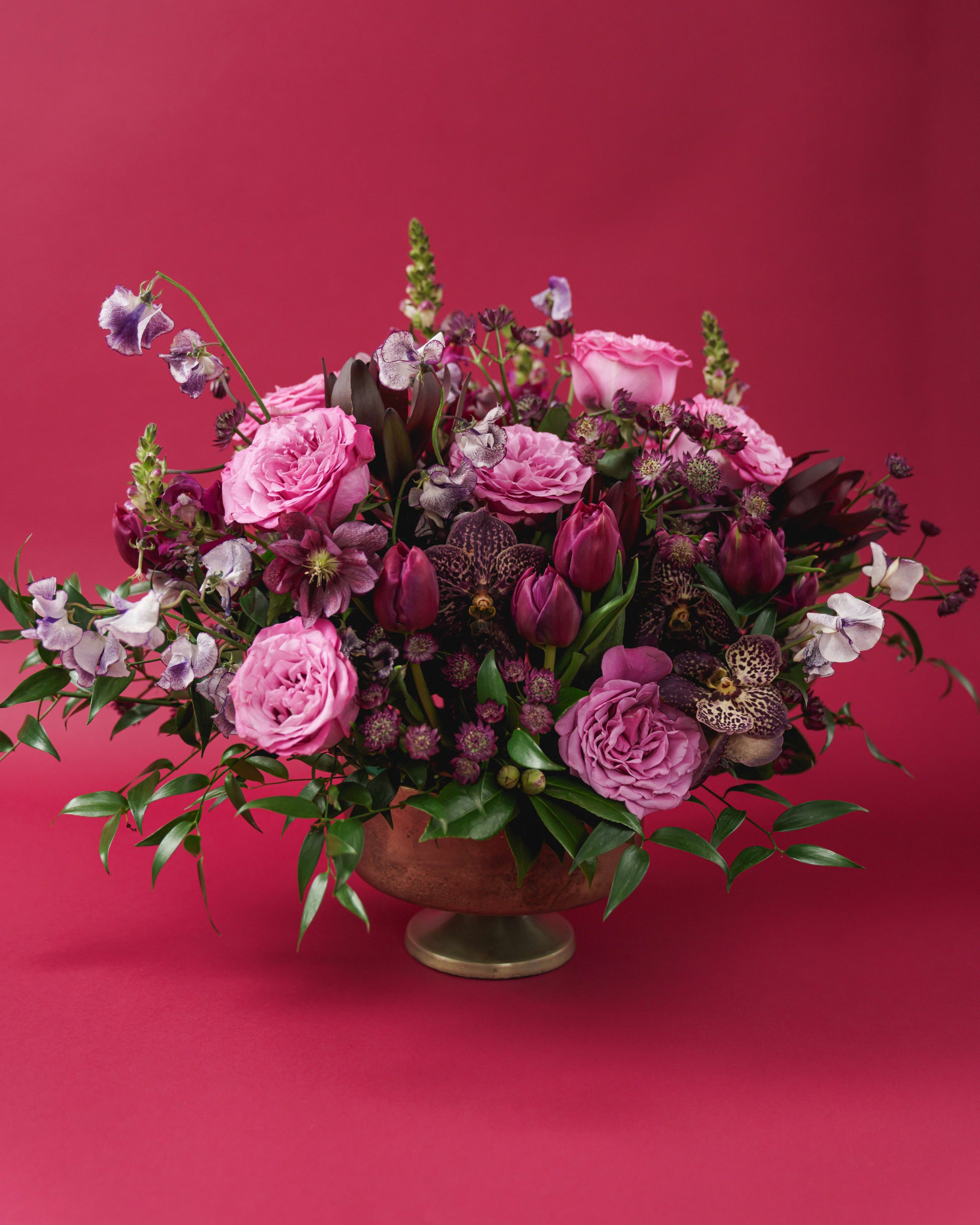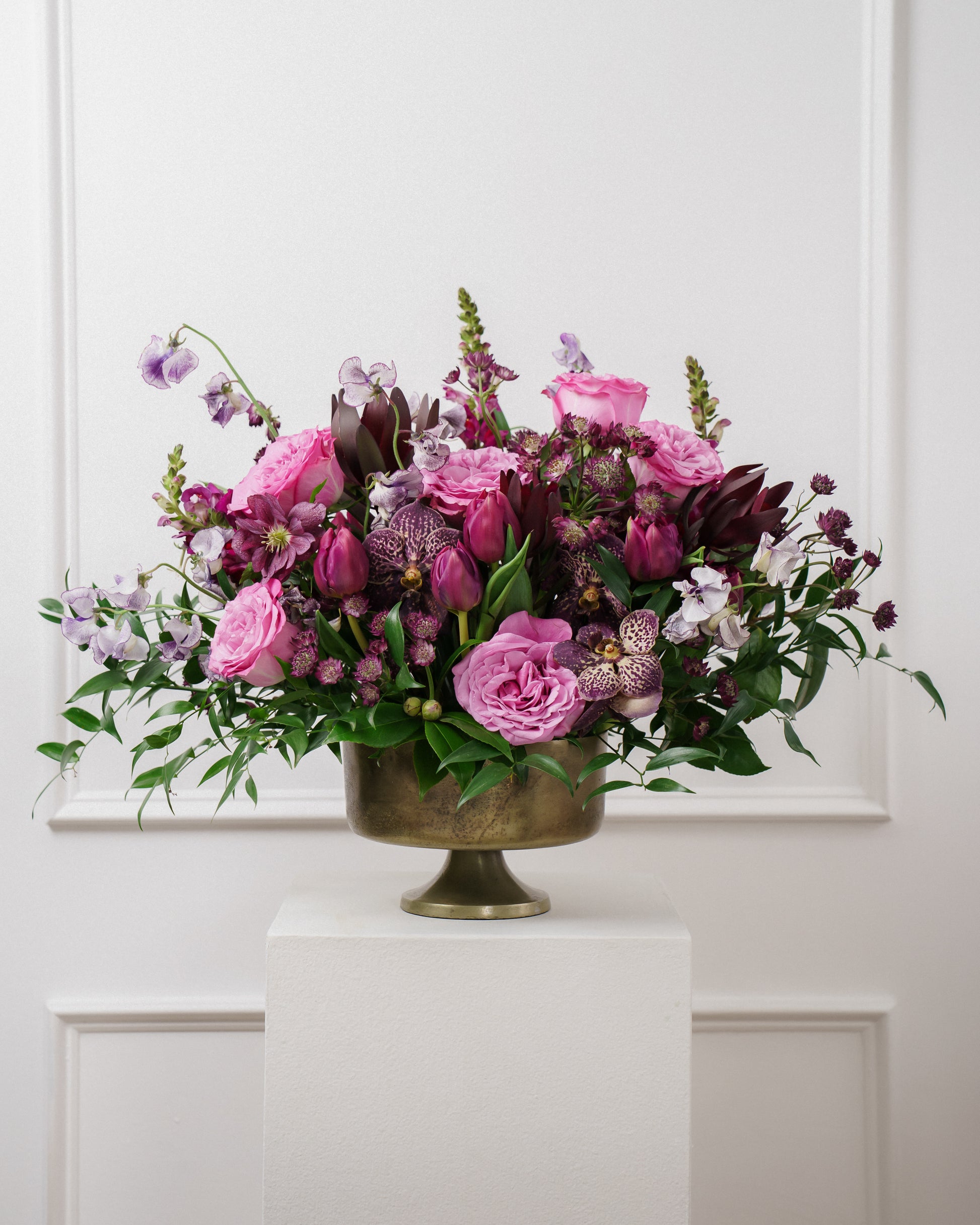An elegant arrangement of lush garden roses, tulips, vanda orchids, sweetpeas, snapdragons arranged in a gold antique metal vase. The soft pink and deep berry tones add a romantic touch to the arrangement, making Nicole a lovely addition to your Valentine’s Day.