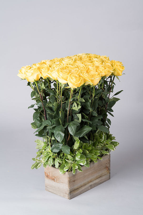A rustic wooden box with 50 Roses arranged as a hedge.