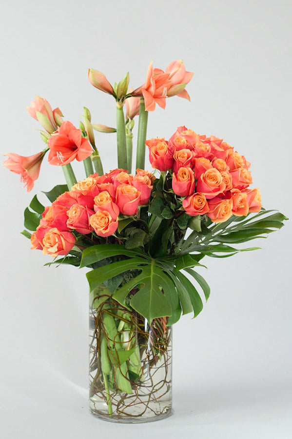 Sculptured roses and amaryllis look lavish and modern. This statement piece of gathered premium roses and amaryllis is sophisticated and architectural. Stalks of amaryllis rise from clusters of cherry brandy roses. Monstera leaves provide volume and shape. This floral arrangement is well-suited for corporate gatherings and reception areas as well as event buffets and entrances.