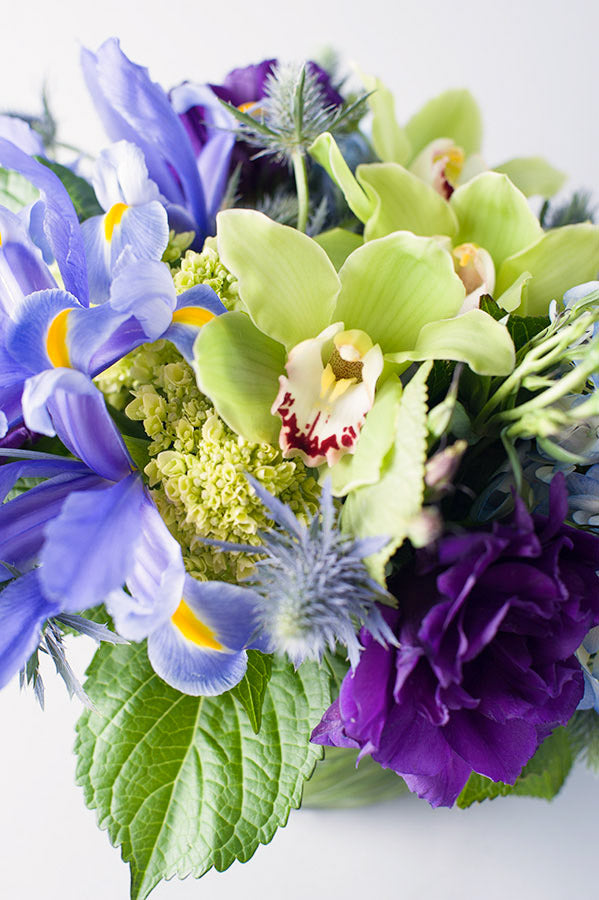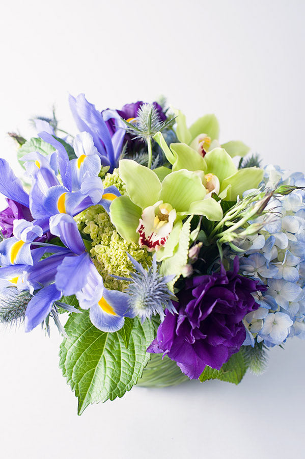 Shady Garden captures the romance and ease of a cool garden. It includes flowers such as lisianthus, iris, thistle, summer hydrangea, and orchids.