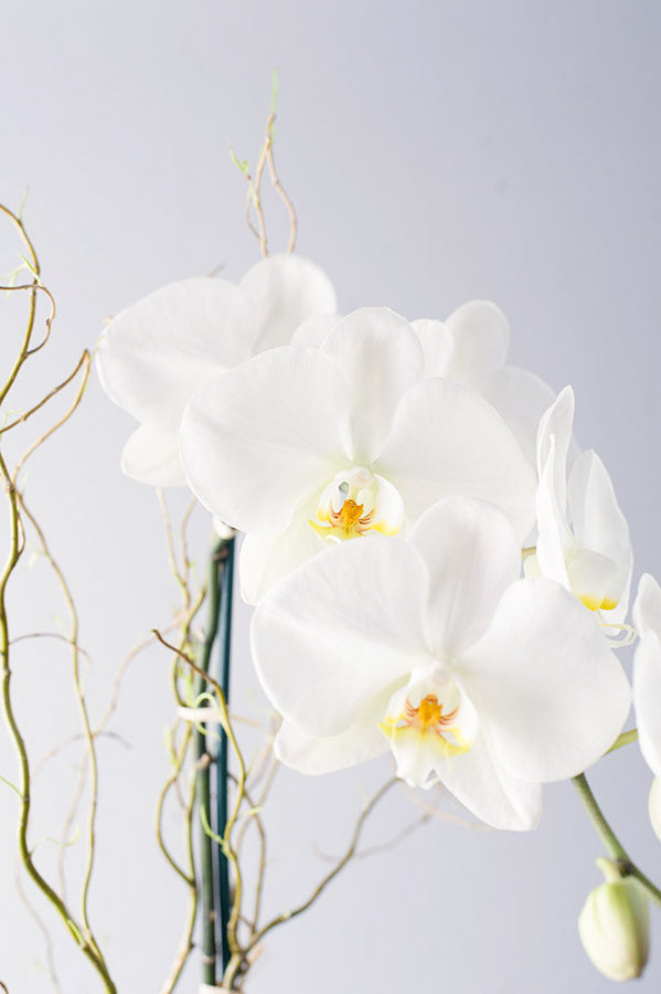 This elegant orchid is perfect for home or office. Our Single Stem White Phalaenopsis Orchid is potted with green moss in a glass orb vase and accented with curly willow and raffia.