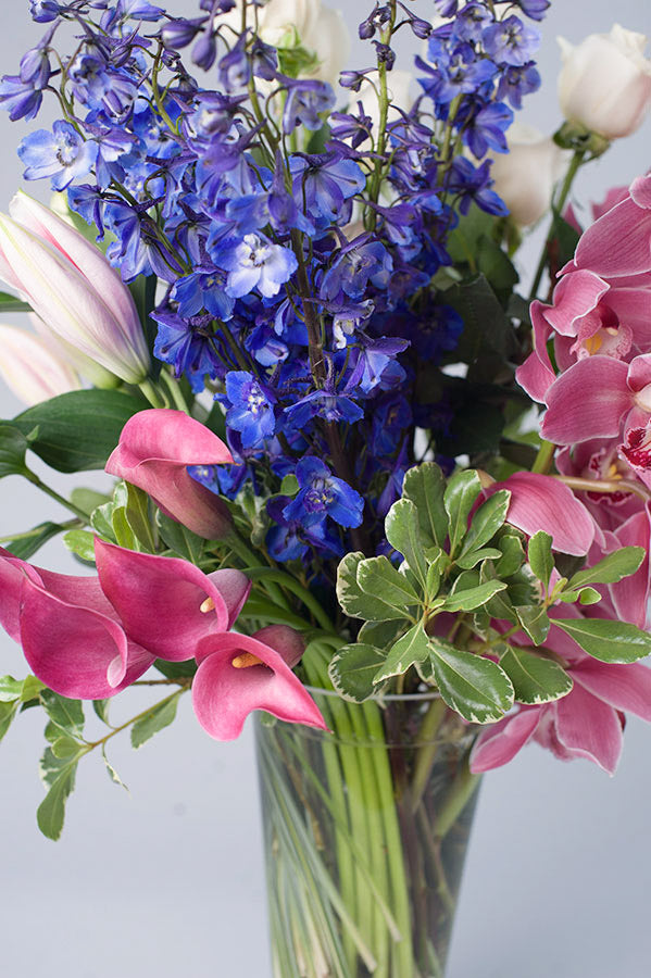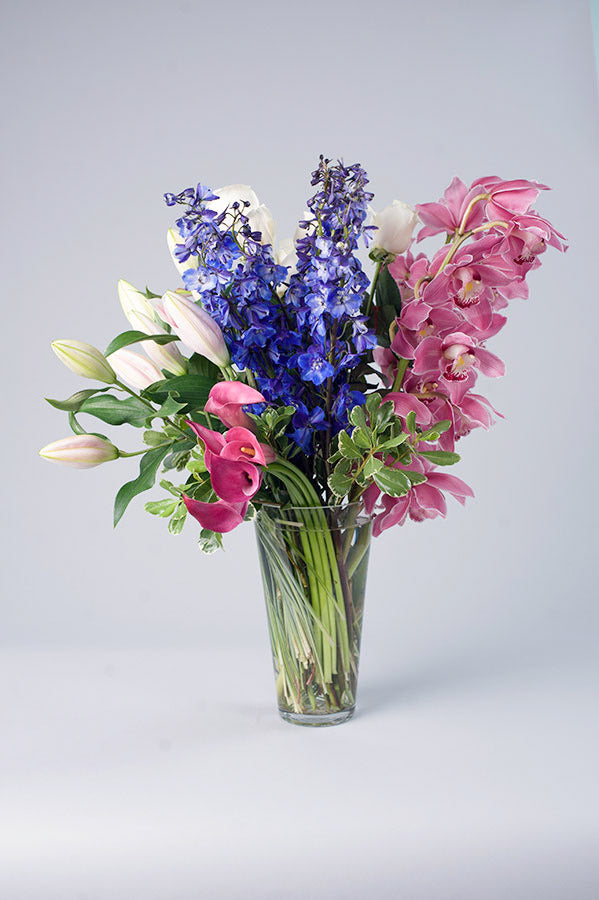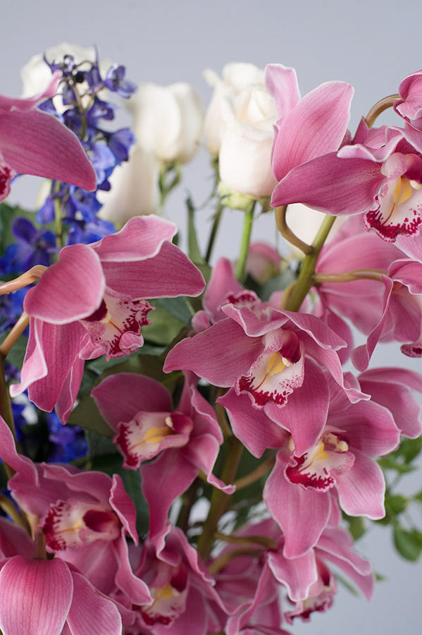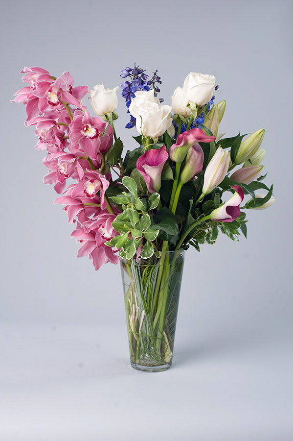 A gathering vase of seasonal flowers including an orchid spray and roses.